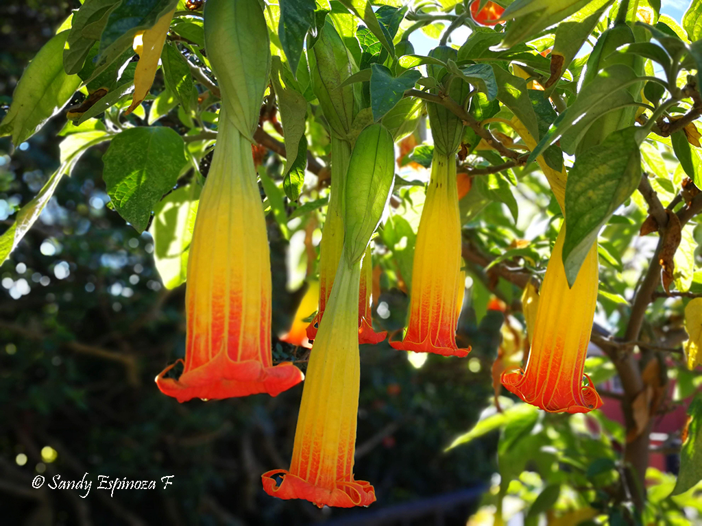 Algunos piensan que soy un árbol porque puedo llegar a medir hasta 11 metros, pero en realidad soy un arbusto, que produce flores muy lindas de hasta 20 centímetros en forma de trompeta. Mis flores producen un aroma característico que se percibe principalmente durante la noche, perfume que atrae a aves, murciélagos e insectos. Mis flores pueden presentar varios colores: amarillas, rojas, rosas o blancas. Una vez polinizadas mis flores producen bayas, las cuales son poco utilizadas o apreciadas.