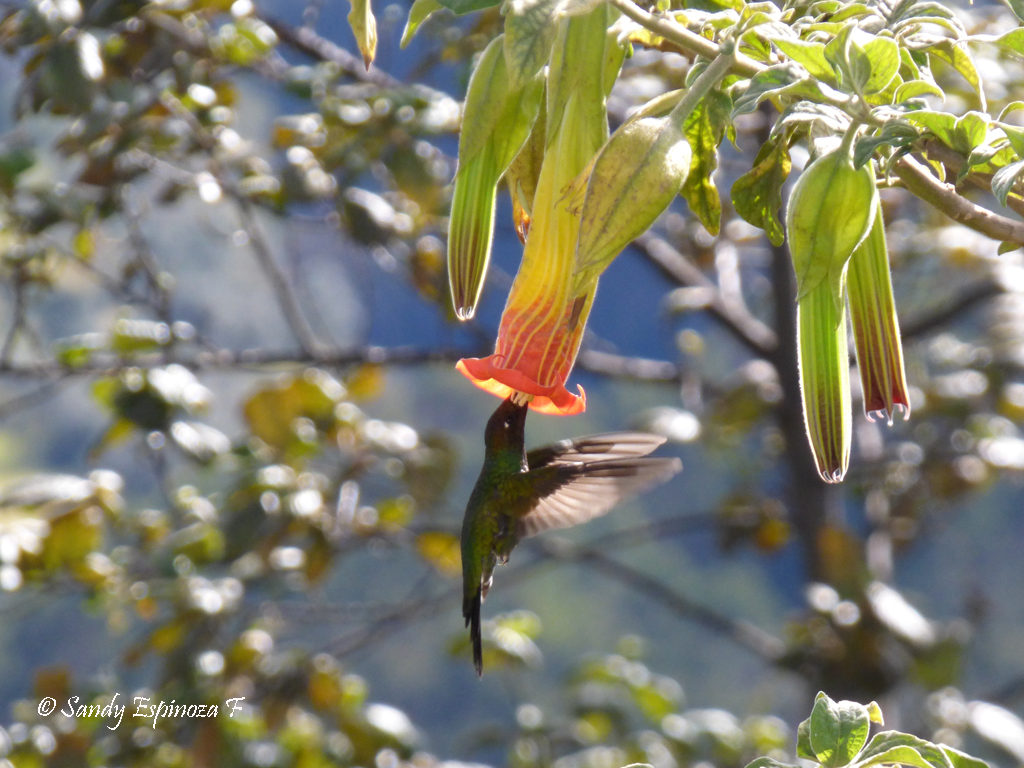- Ensifera ensifera o Colibrí Pico Espada se alimenta de mis flores cuyo pico es considerado de los más grandes con una longitud de 13-15 cm. Es de color verde amarillento en la cabeza y un verde claro en el resto del cuerpo, con cola un poco larga y bifurcada.