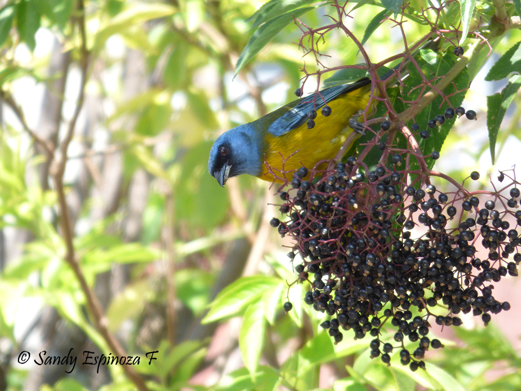 Soy una de las tangaras más coloridas que viven en la ciudad, el azul y amarillo del macho llaman mucho la atención, soy muy curiosa y confiada suelo acercarme a los espejos de los autos para pelear con mi reflejo. Me alimento de frutos, si colocas oritos o bananos en tu jardín podrás verme diariamente.